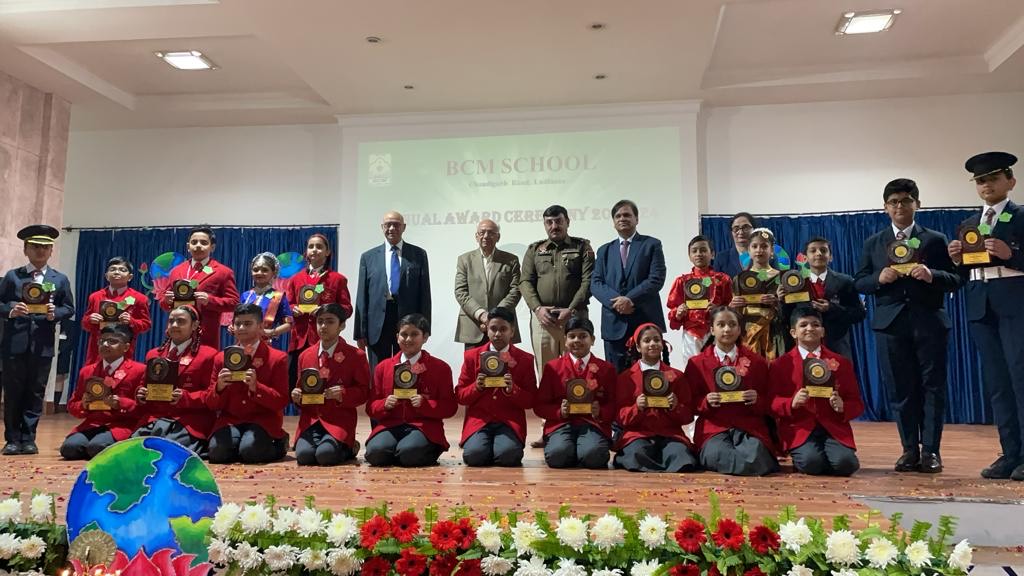 Honouring and appreciating the achievers with accolades, the Annual Award Ceremony of BCM School, Chandigarh Road for the session 2022-23 was held with great zeal and enthusiasm at Mata Thakur Devi Auditorium on December 14, 2023. The function turned out to be a kaleidoscope of a series of thematic performances showcasing the theme of “One Earth, One Family, One Future”. It was an endeavour to acknowledge and award students for their continuing saga of glorious achievements in the School Examinations for the academic year session 2022-23. Mr. Sumit Sood, ACP, North and Sh. Suresh Chandra Ji Munjal, Trustee BCM Foundation were among the distinguished guests. Around 500 students participated in this gala event. Parents were also present in a large number to encourage and cheer the students. The programme started with the lighting of the ceremonial lamp followed by an exhilarating welcome dance which enthralled the audience. School Principal DP Guleria welcomed the august gathering. He also encouraged the students to continue taking initiatives that would polish and enrich their talents. Students of class II conveyed a powerful message of Global Unity through their Choreography on the theme “One Earth, One Family, One Future”. Power-packed folk dances of India added to the grandeur of the show. Class toppers from I to V were honoured with Mahatma Satyanand Ji Munjal Trophy and overall toppers were awarded with Brij Mohan Lal Munjal Trophy. Laksh Jain was announced as the proud recipient of Scholar Blazer for being the overall topper for three consecutive years. The grand spectacle concluded on a happy note with a vote of thanks followed by the National Anthem.