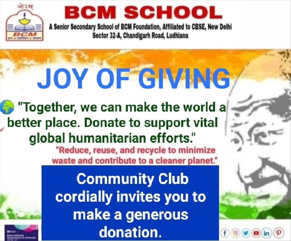 BCM School, Ludhiana, a renowned educational institution with the strength of approximately 7000 students known for its commitment to holistic education and community engagement, has a vibrant Community Club that actively participated in the social initiative JOY Of Giving. This initiative, organized by CityNeeds ("Daan Utsaav") in association with the Municipal Corporation in the month of October (1st - 12th), aimed to contribute to the welfare of the city. Students, parents and teachers enthusiastically participated in the initiative, donating clothes, shoes,books, medicines s, stationery items eatables, e-waste, and other items.